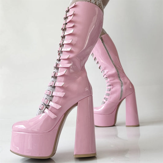 Product information: Pattern: Solid Color Lining Material: Faux Leather Color: Pink Heel Height: Super High...