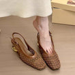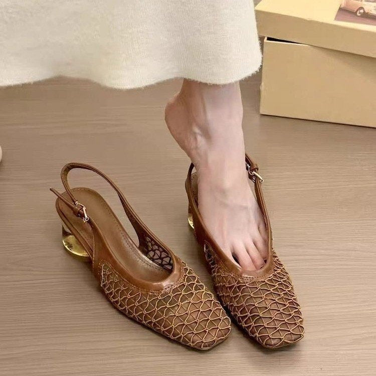Elevate your 2025 summer look with these chic French retro square-toe slingback heels. Featuring a delicate geometric mesh upper, a sleek solid-color design, and a unique transparent block heel with gold-tone accents, these shoes blend timeless elegance with modern sophistication. The adjustable slingback strap ensures a secure, customized fit, making them perfect for office wear, brunch dates, casual outings, or special occasions. Step into comfort and style while enjoying a subtle 5cm height boost that elongates your legs effortlessly.